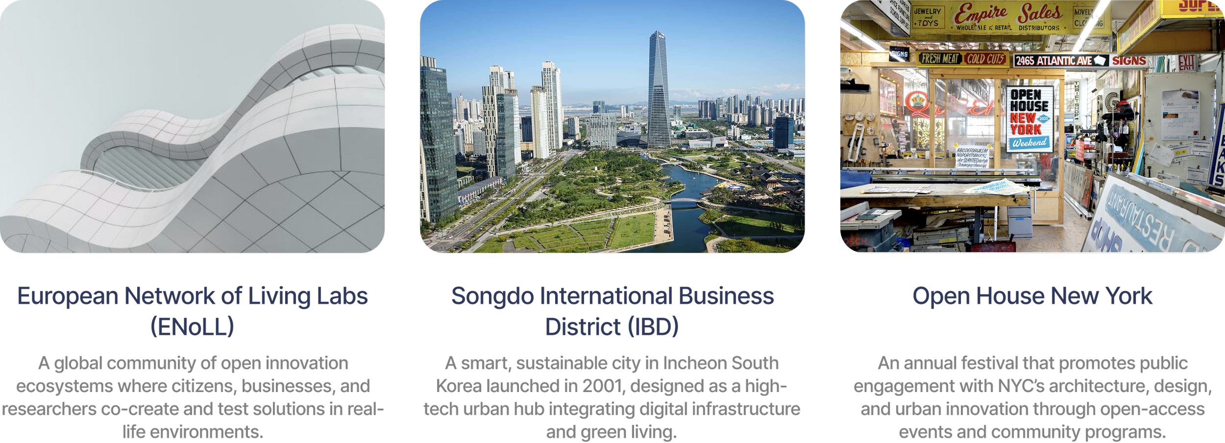 Before we talked to anyone, we did our homework. We looked at three very distinct innovation communities for inspiration: The European Network of Living Labs (ENoLL), Songdo International Business District in South Korea, and Open House New York (OHNY).