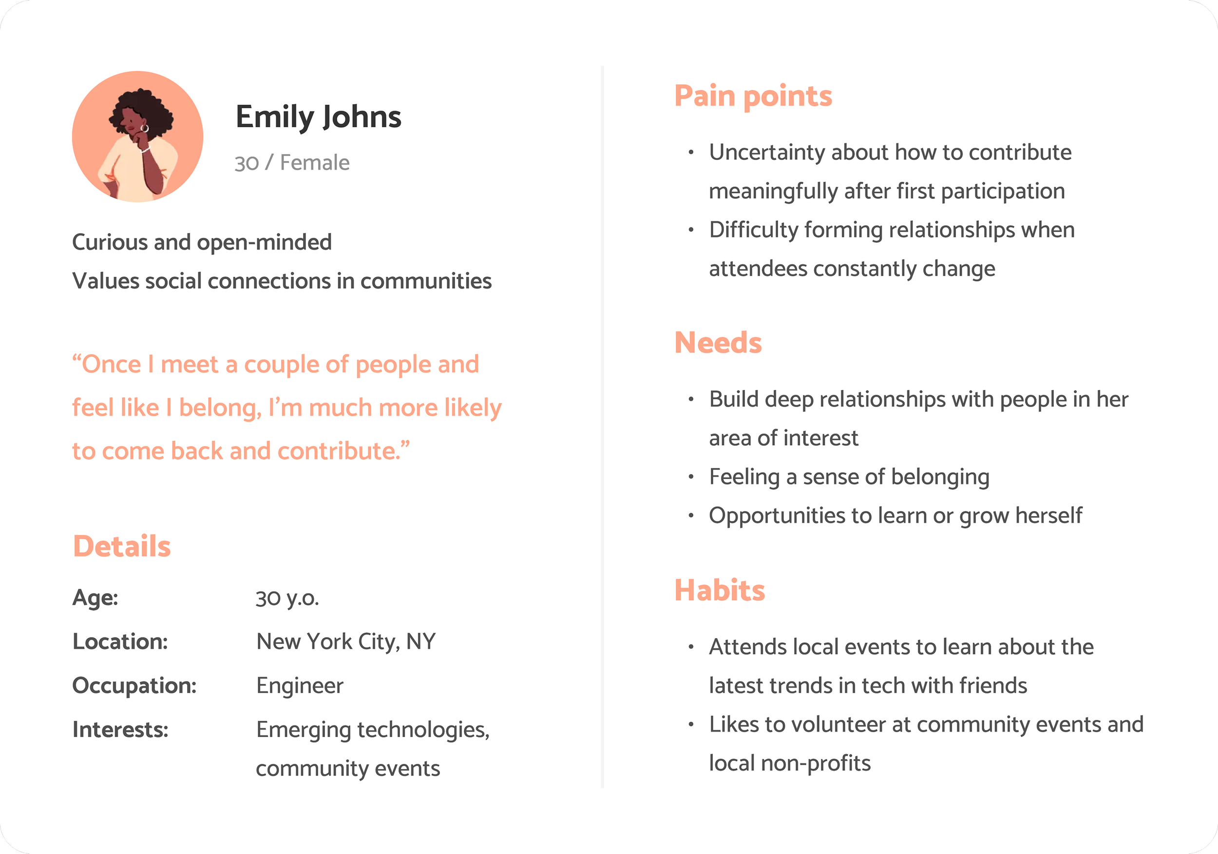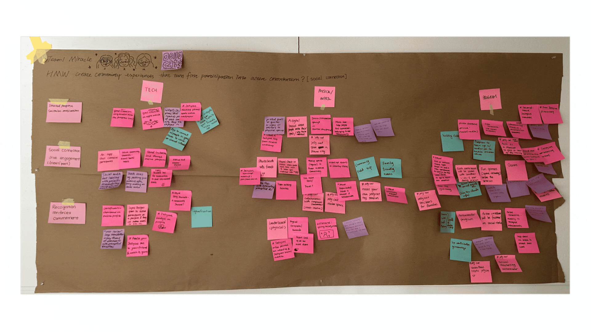 We brainstormed with a single focus: leveraging social connections to turn Emily from a first-time participant to an active contributor across three territories: Technology, Physical Infrastructure, and Programs/Events.