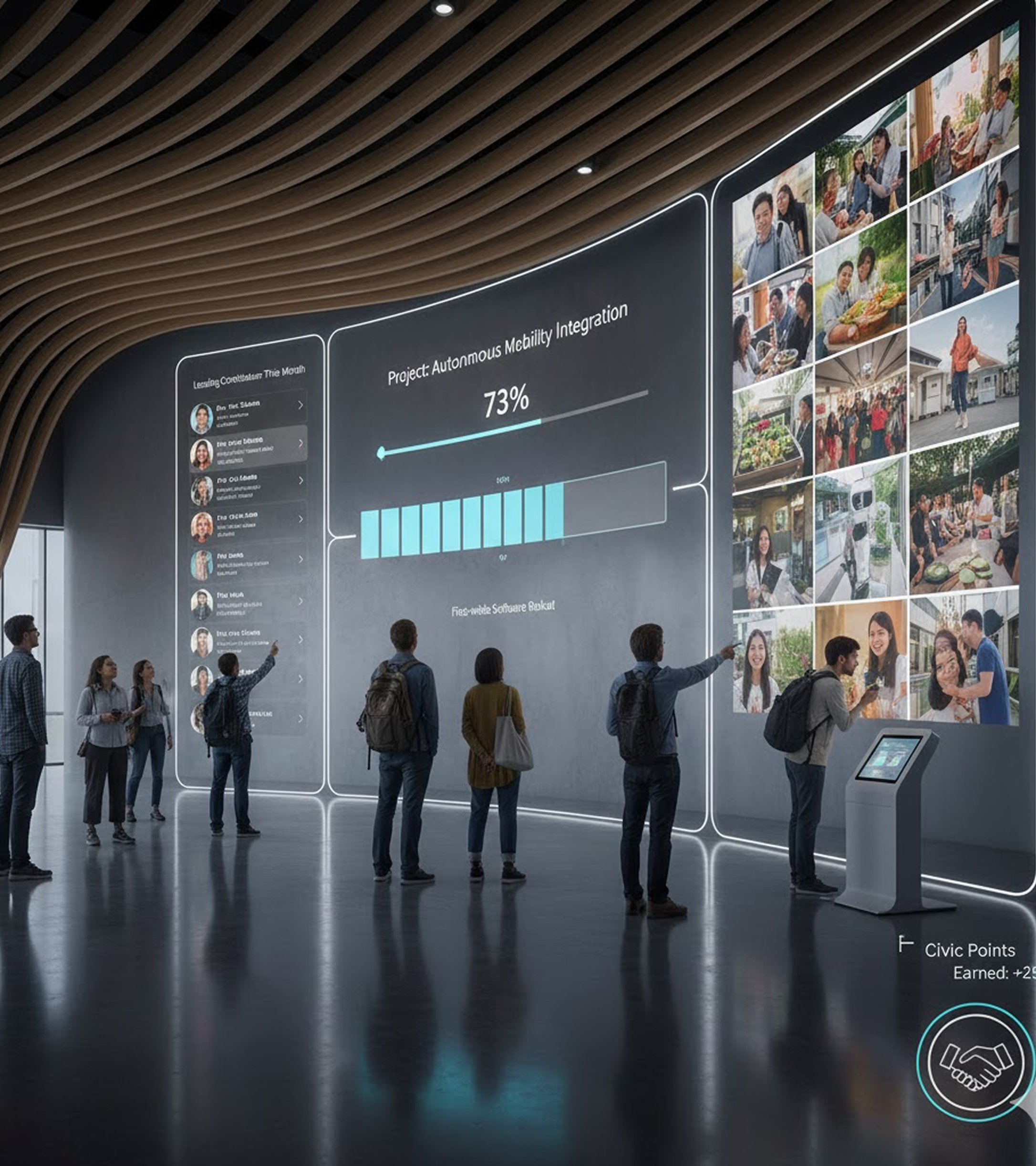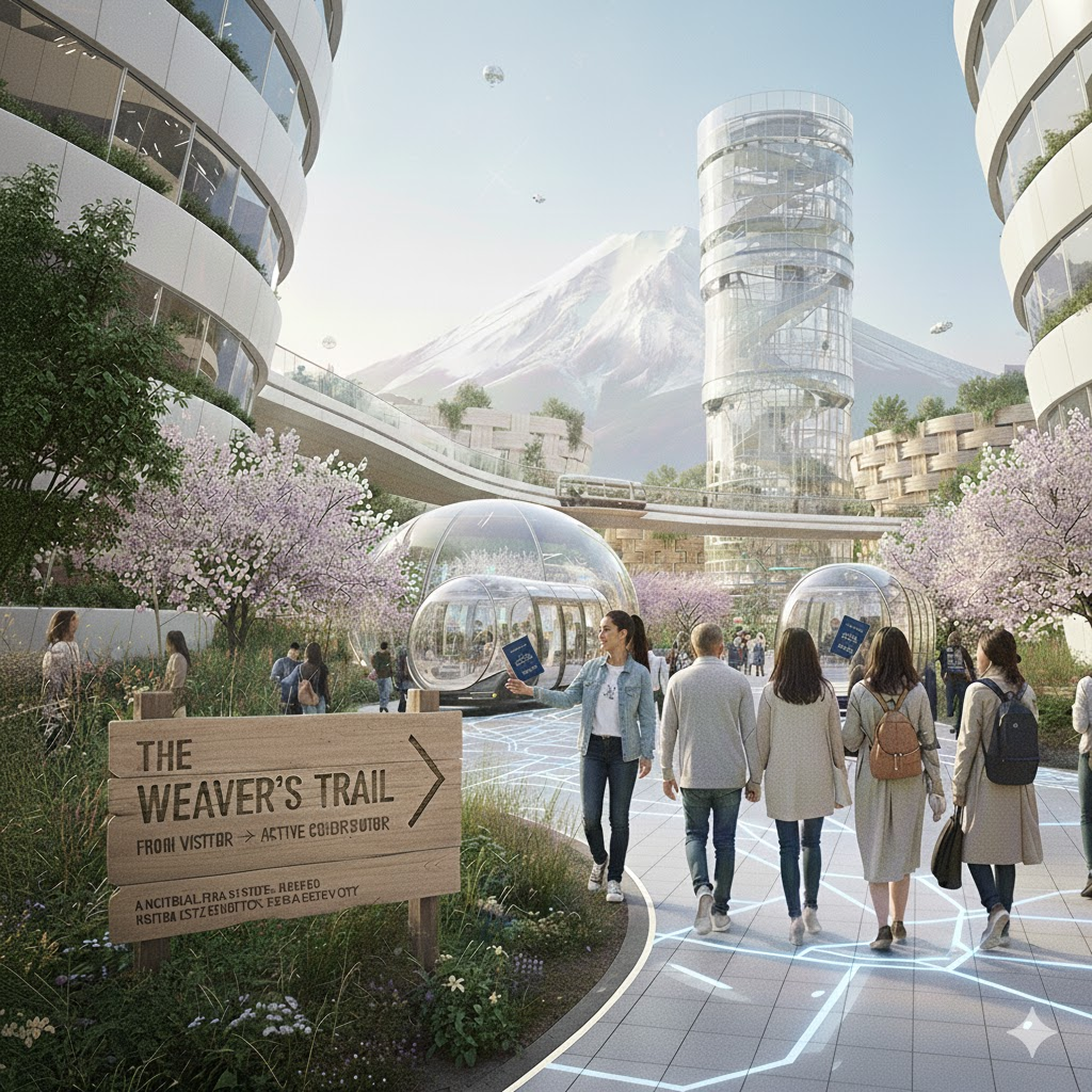 The Welcome Center doesn't just orient visitors, it connects them to values, people, and a shared journey. Visitors learn city values, choose a themed trail, meet a Weaver Guide, and receive a Weaver Passport that transforms exploration into action. From there, Weaver Guides bring city systems to life along Themed Contribution Trails, while contribution points invite visitors to engage with and provide feedback on live innovation initiatives and discover how they can get involved today and in the future.