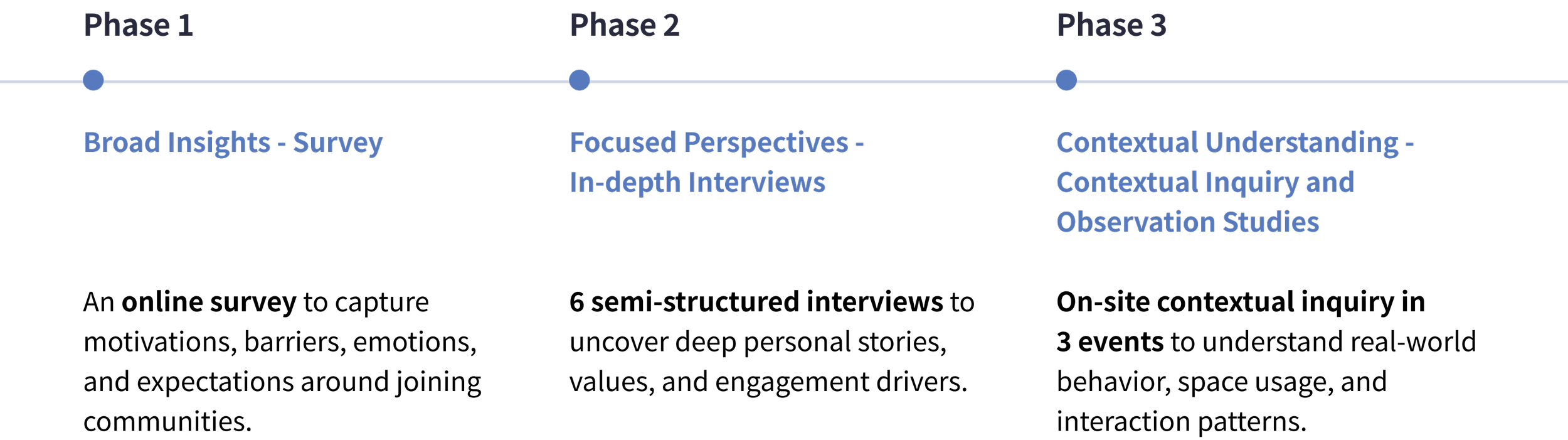 We ran a three-phase study designed to move from broad signal to lived experience to real-world behavior.