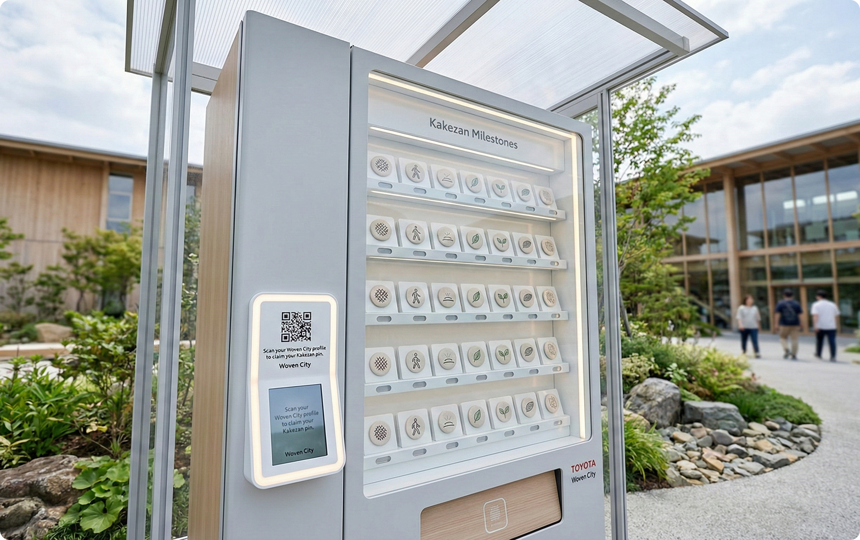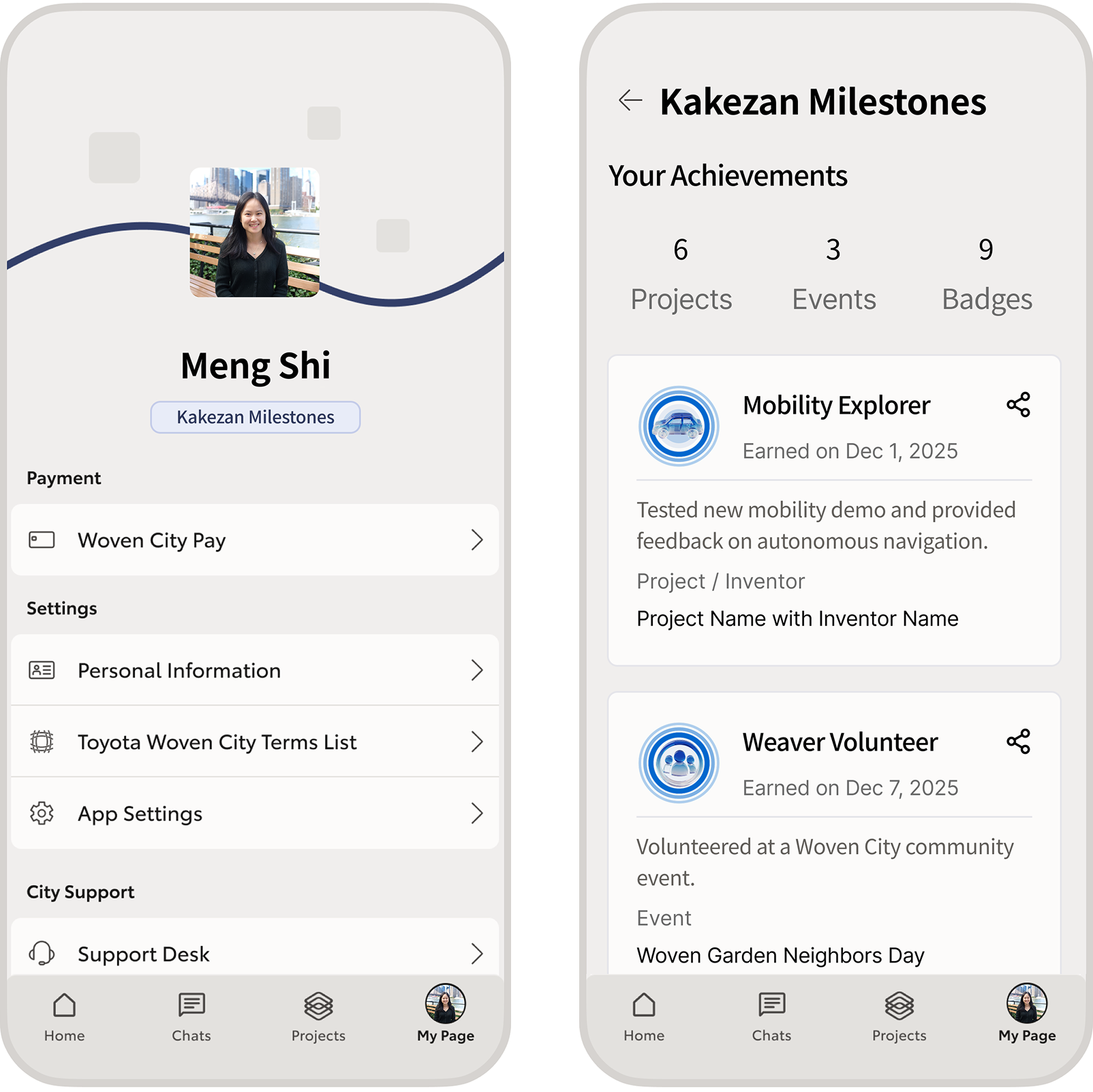 Kakezan Milestones is a co-creation award system proposed as a new feature for the existing Woven City app. Directly addressing our insights on recognition and visible progress, it ensures every contribution, whether a test, co-creation session, or community event, is captured as a digital milestone badge on a resident's profile, linked to the specific project it supported and shareable with friends, family, and colleagues.